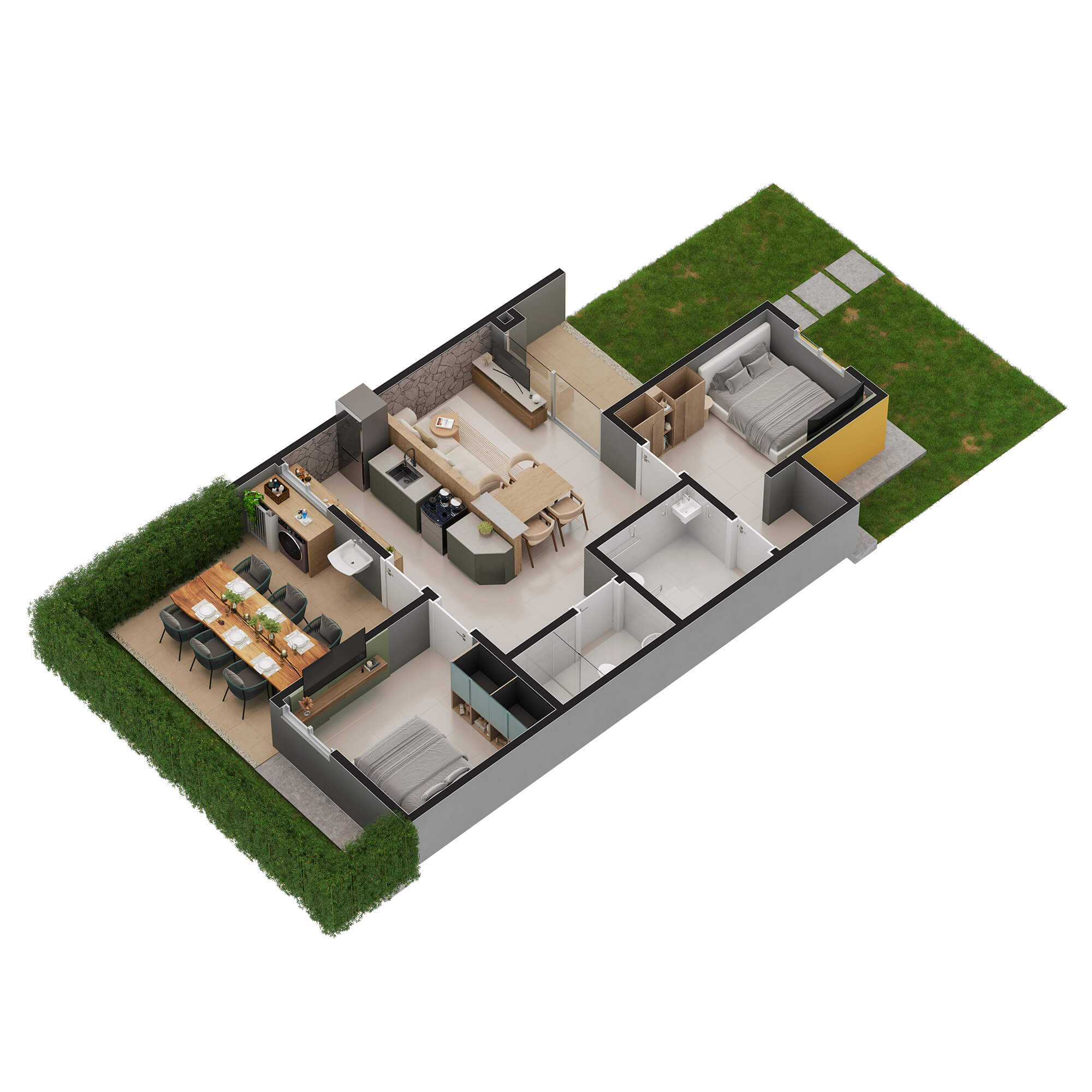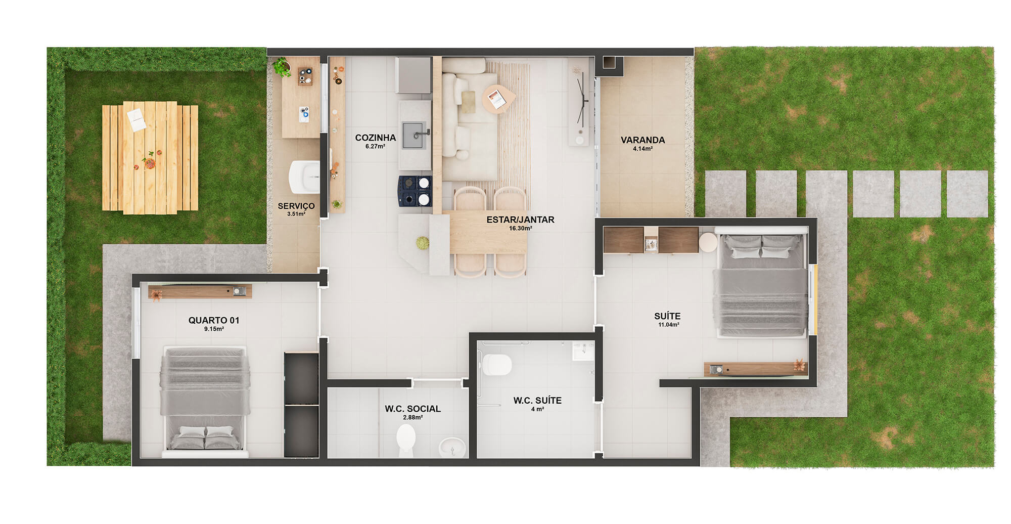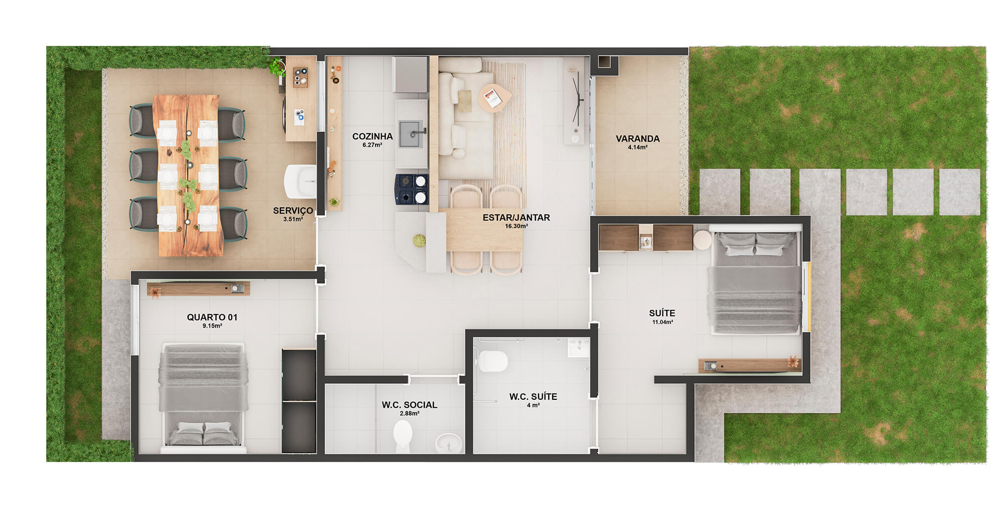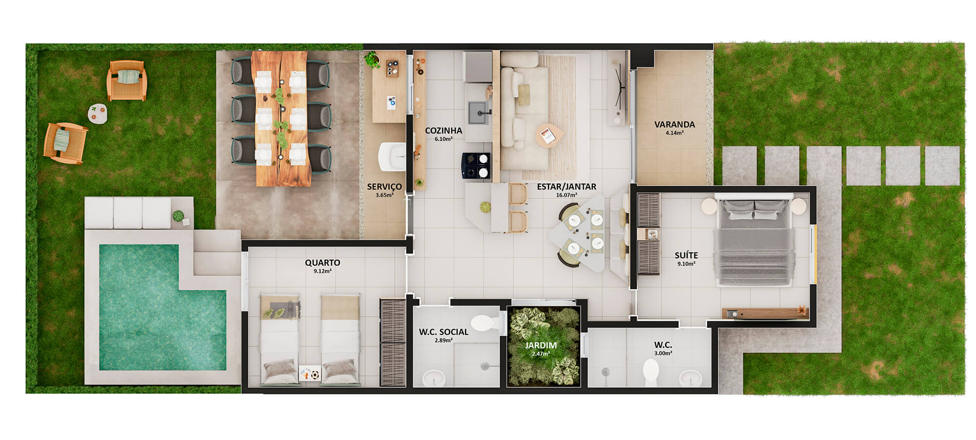 Planta Padrão, 2 quartos sendo 1 suíte. 62,56m². Terrenos de 116m² a 170m². Perspectiva ilustrada. Consulte o corretor para escolher o terreno ideal. Extensão de piso na área de serviço e piscina são ilustrativas, casa entregue