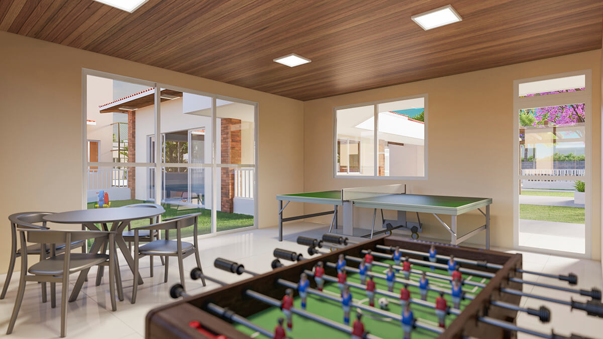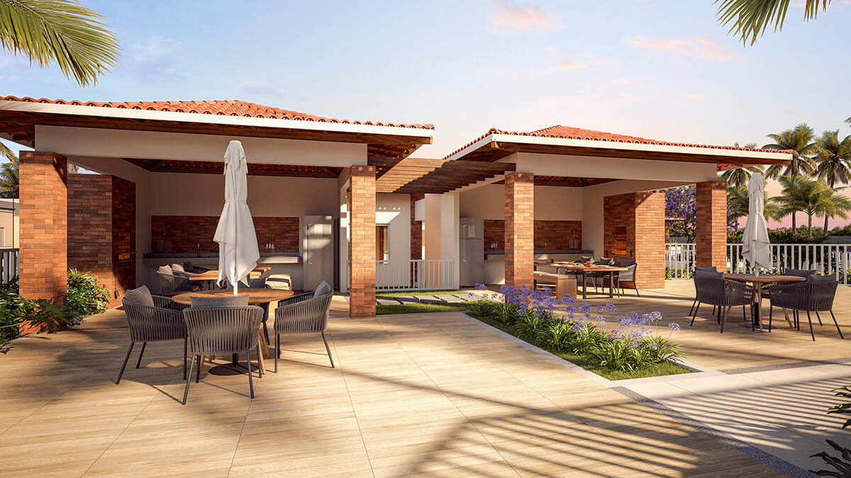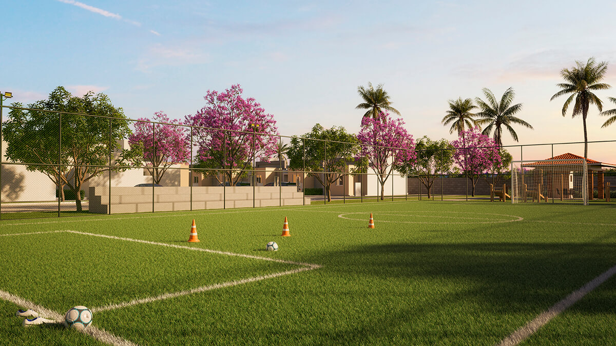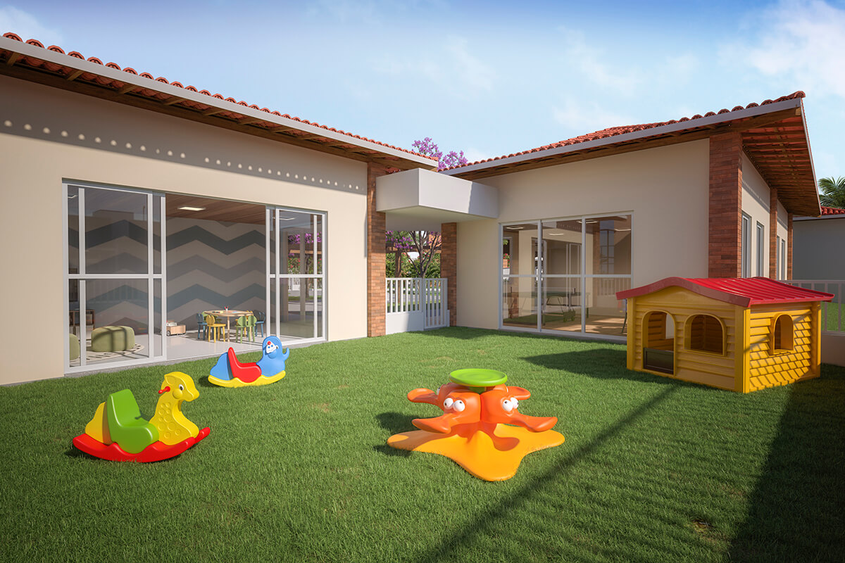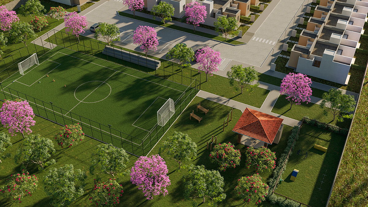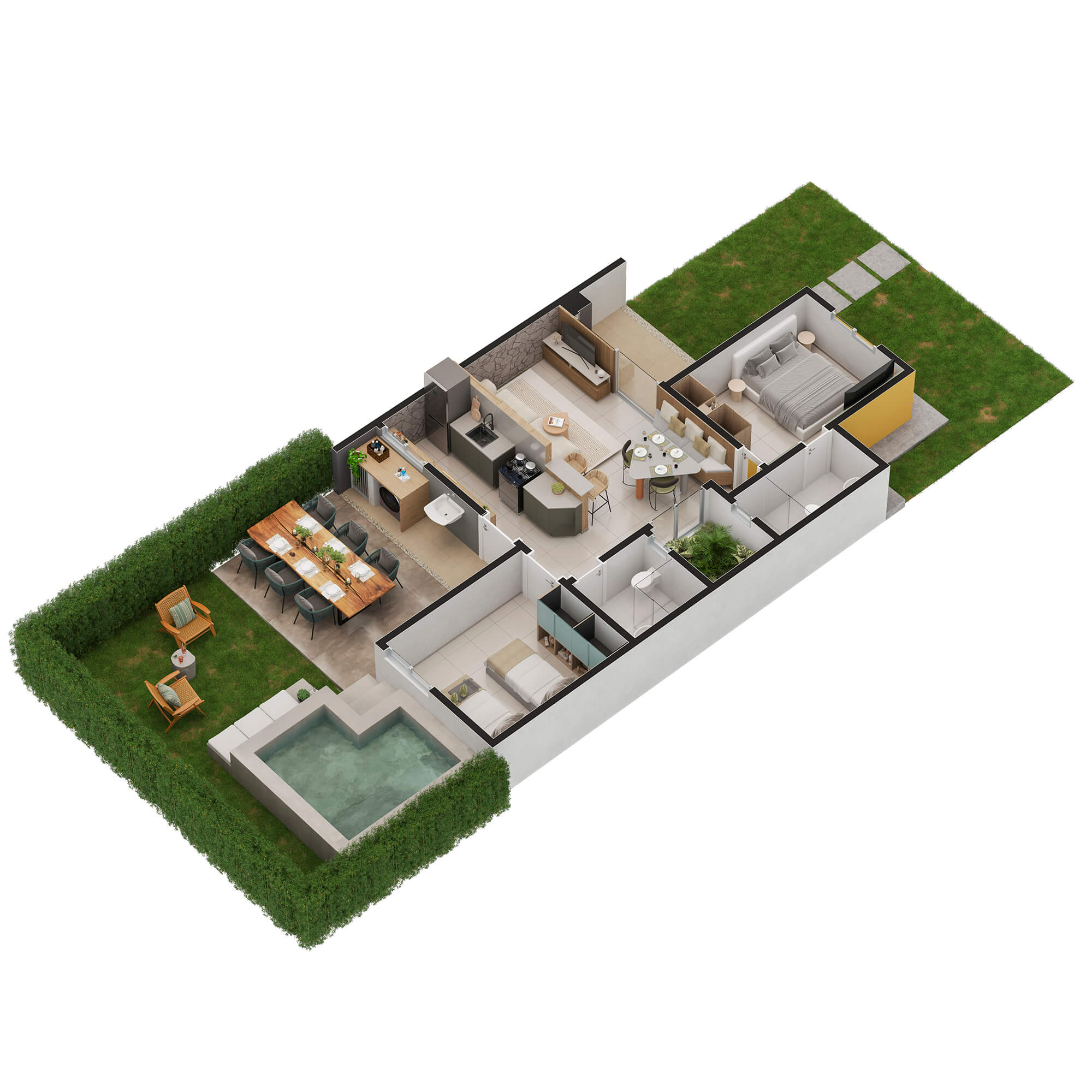 Planta Padrão, 2 quartos sendo 1 suíte. 62,56m². Terrenos de 116m² a 170m². Perspectiva ilustrada. Consulte o corretor para escolher o terreno ideal. Extensão de piso na área de serviço e piscina são ilustrativas, casa entregue