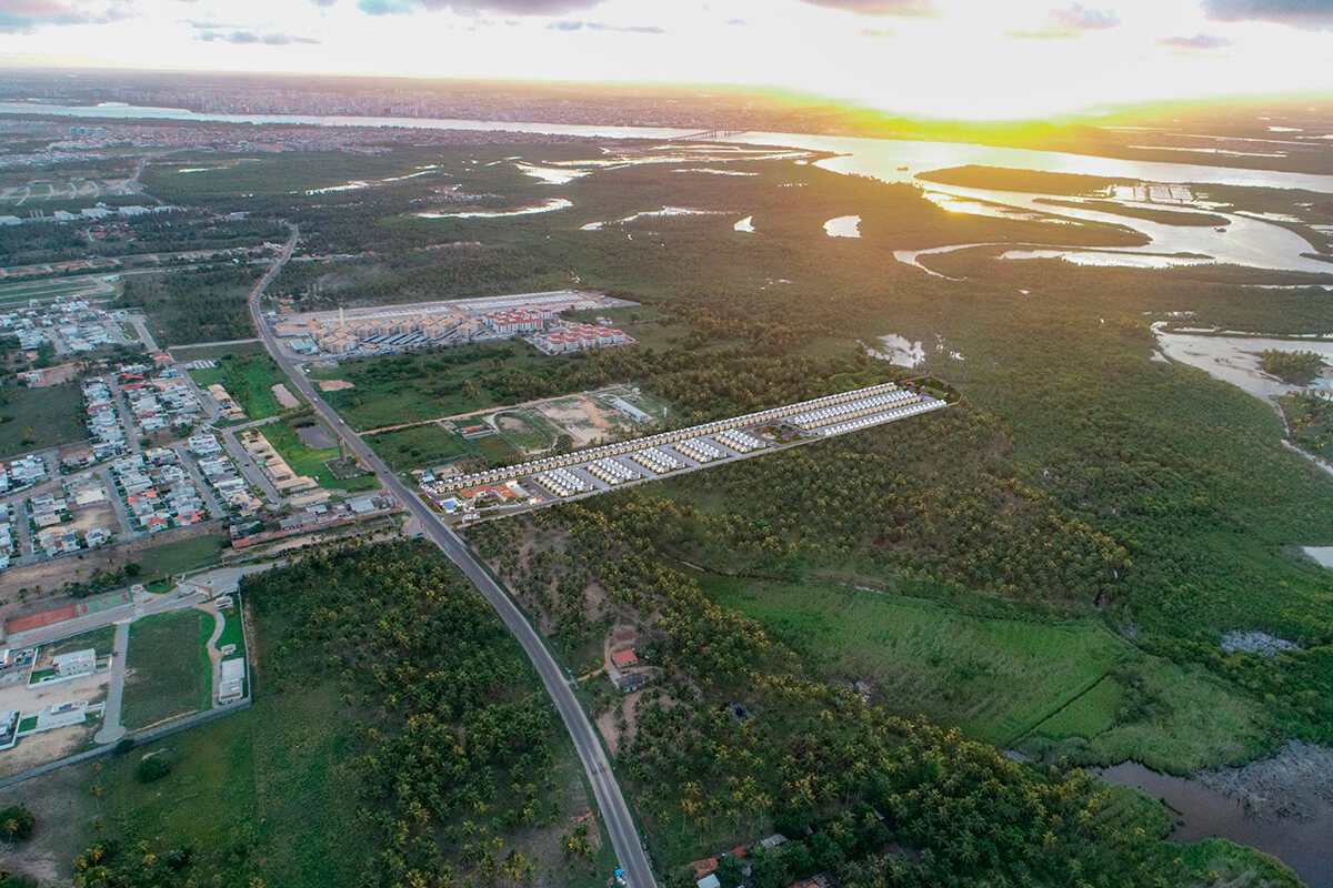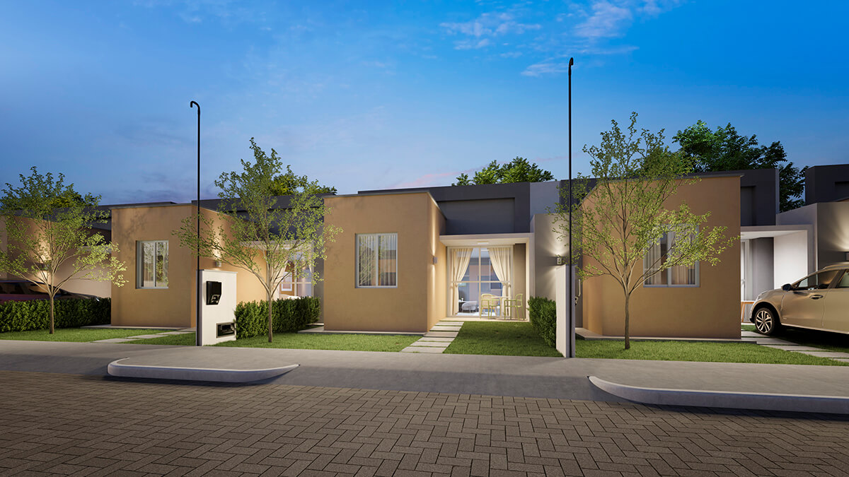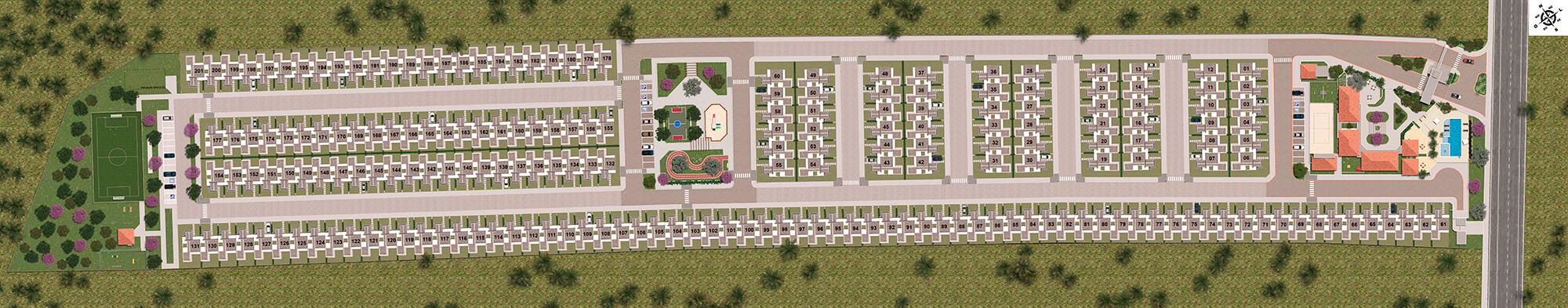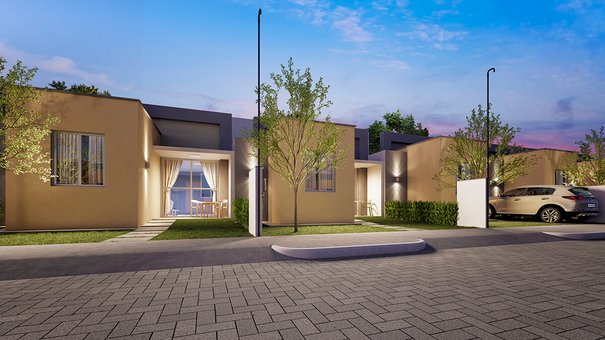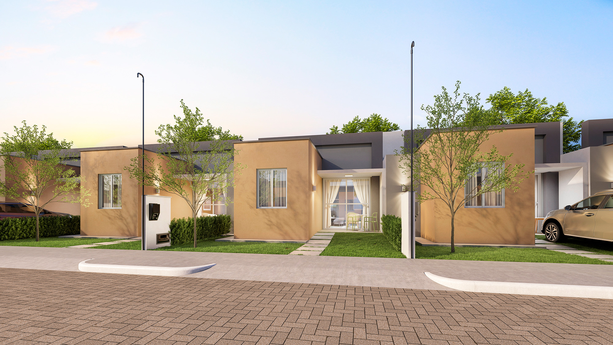 Planta Padrão, 2 quartos sendo 1 suíte. 62,56m². Terrenos de 116m² a 170m². Perspectiva ilustrada. Consulte o corretor para escolher o terreno ideal. Casa entregue conforme projeto e memorial.
