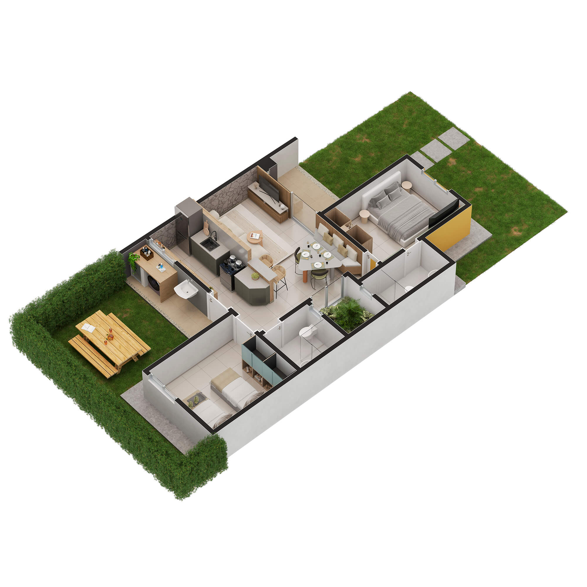 Planta PCD, 2 quartos sendo 1 suíte. 66,20m². Terrenos de 116m² ou 146m². Perspectiva ilustrada. Consulte o corretor para escolher o terreno ideal. Extensão de piso na área de serviço é ilustrativa, casa entregue conforme projeto e memorial.